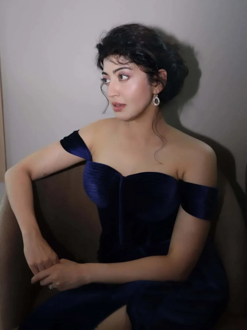 In the photos, Pranitha is seen wearing a deep blue off shoulder gown. The dress fits neatly and has a high slit that shows one leg as she stands beside a tall window. Natural light from outside falls across the room, giving the pictures a calm and stylish feel. Her hair is tied up loosely and the makeup is kept simple. She leans against the wall in a relaxed pose, looking straight at the camera, letting the outfit and attitude speak for themselves.