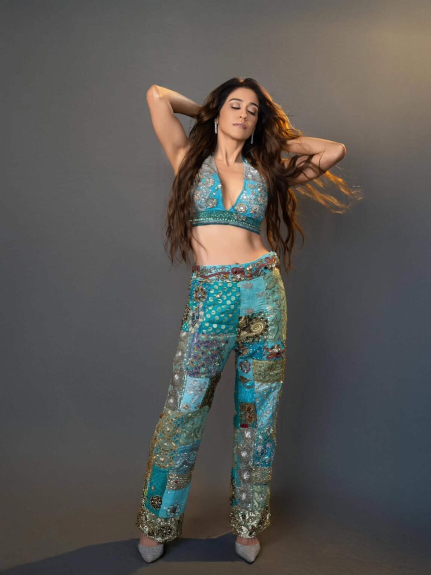 In the shoot, Regina is seen wearing a striking turquoise outfit featuring a stylish bralette top paired with patchwork pants. The intricate embroidery and shimmering details add a rich, ethnic-meets-contemporary vibe to the look. Her open, flowing hair and minimal accessories keep the focus on her outfit and physique, while her confident pose enhances the overall appeal. With this look, Regina effortlessly proves that she continues to evolve in style and presence, staying relevant and inspiring in the industry.