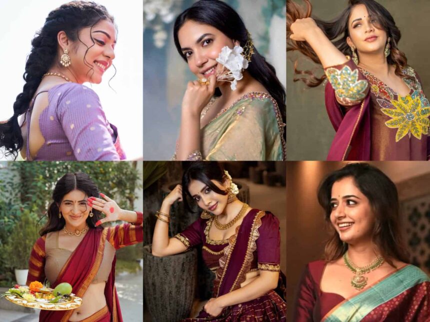 Then comes Ashika Ranganath, who sticks to timeless elegance. Her maroon saree with a green border gives strong classic vibes, focusing on richness and tradition rather than experimentation.